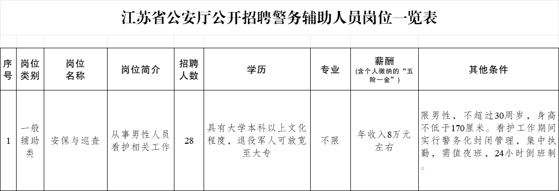 根据工作需要和有关规定,江苏省公安厅面向社会公开招聘28名警务辅助人员(以下简称辅警,非人民警察身份且非事业编制人员身份)。现将有关事项公告如下: