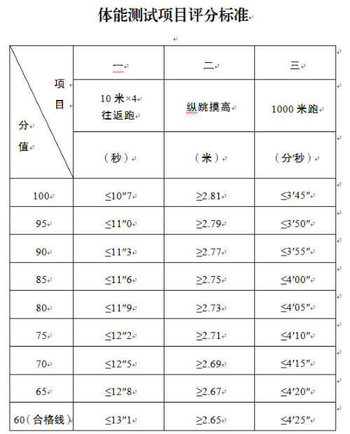 通过资格初审的人员,进入体能测试环节。体能测试参考公安机关录用人民警察体能测评项目和标准进行,测试项目包括:10米×4往返跑、纵跳摸高、1000米跑,根据各项目评分标准进行赋分(评分标准附后),三个项目得分的平均数为体能测试成绩(成绩保留至小数点后两位)。同时,每个项目设置合格线,任何一项不合格,即视为体能测试不合格。体能测试合格的人员中,根据体能测试成绩由高到低排序,按岗位招聘计划1:2的比例确定进入下一环节人员名单(体能测试成绩相同的一并进入下一环节)。